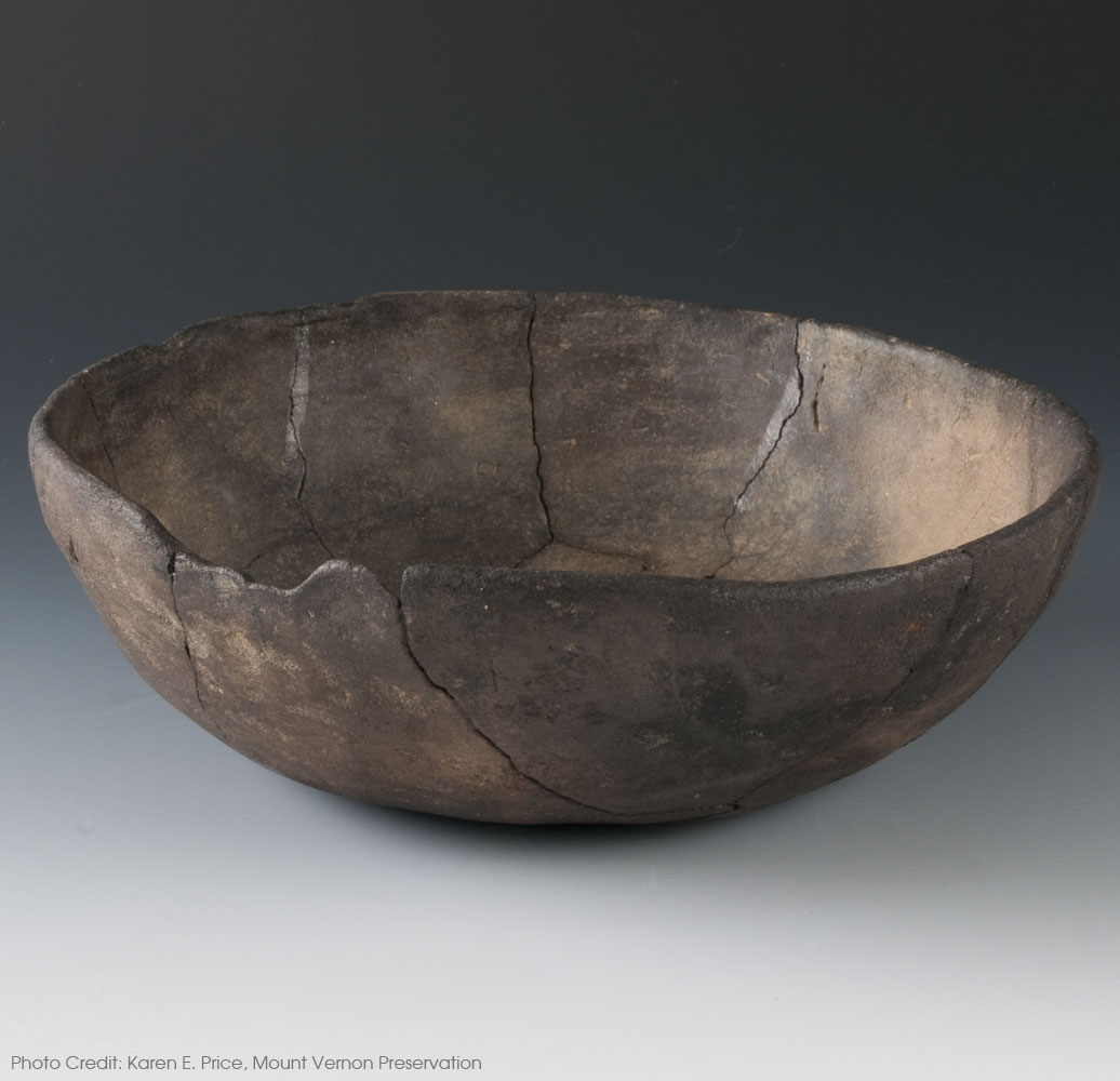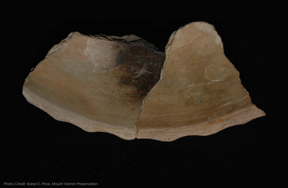 Eighteenth-century consumers flocked to local markets to purchase a vast array of imported goods including the latest ceramic tablewares for display and use in their homes. Locally-made colonoware offered enslaved consumers cheaper and more accessible alternatives to costly imported European ceramics. Virginia colonoware was produced in a variety of forms to satisfy the market, including plates, bowls, pipkins, porringers and chamber pots. This bowl with a flared rim, recovered from the Pope site in Virginia, mimicked a popular rim style on refined wares of the eighteenth century. Bowls with everted rims and marleys were seen on many fashionable imported wares throughout the time period.