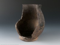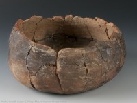 Bowls and jars are by far the most common colonoware vessel forms on South Carolina plantation sites. Jars were ostensibly used to heat liquids and cook stews and the like. This is an interior view of a flat-based jar from Curriboo plantation in South Carolina. Pots like this with flat (not rounded) bases are absent from the archaeological record at pre-European contact sites. Before their implementation, vessels would have been suspended or supported by stones over an open fire during cooking. Flat bases allow the pots to sit flat on European-style hearths and tables. Note the sooting present on the exterior of this jar, a result of its life as a cooking pot.