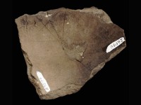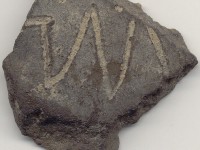 The marks on the base of this sherd (an “X” inside a rectangle), from Curriboo Plantation in South Carolina, were added after the vessel was fired, not during its manufacture. Researchers have postulated these infrequently occurring marks, located on the bases of colonoware bowls in particular, have some religious or curing significance (Ferguson 1992, 1999; Ogata 1995).