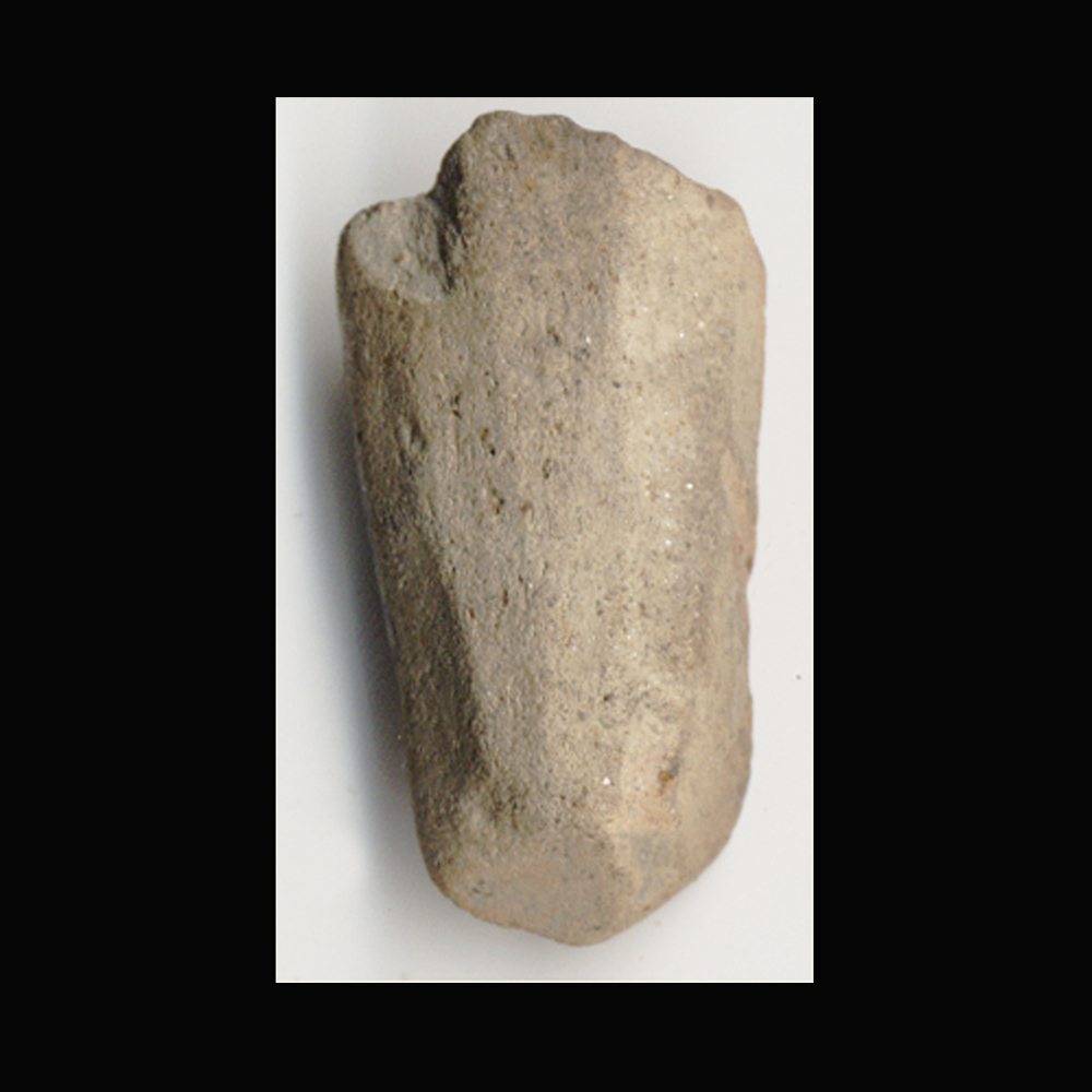 This example, from Yaughan Plantation in South Carolina, is a “foot” or podal support that would have attached to the base of a pot. The form is clearly influenced by pot supports used on European-style hearths and on tables, an attribute not seen on pottery at pre-European contact period archaeological sites.