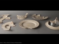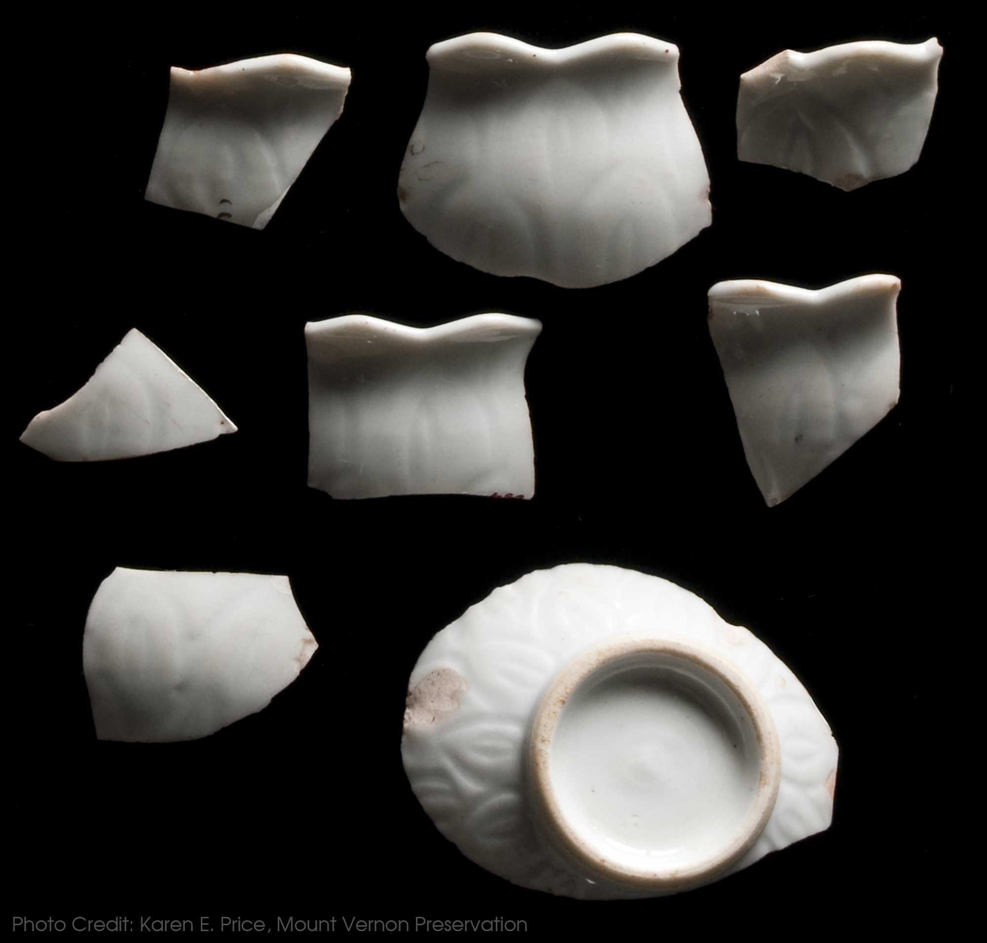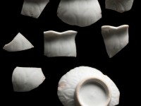 These sherds represent just a few of the numerous an hua mustard jar sherds found in the West Kitchen Yard area. Each vessel has faint molded artichoke-style decoration, a classic an hua design. An hua referes to the subtle decoration that was incised on the body of the vessel prior to firing; an hua decoration is often only noticed when light catches on the vessel.