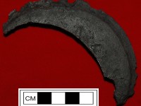 This cast iron fragment is part of a lid to a cast iron cooking vessel. Found in the Dry Well, it is one example of the kitchen-related artifacts found within a deposit of kitchen refuse. Other kitchen-related artifacts included charred seeds and fruit pits, animal bone fragments, utilitarian food storage vessels, milk pans, and large iron cooking implements.