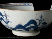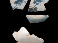 These Delft bowl fragments are from a fairly large bowl, similar in size to the Chinese porcelain bowl featured in this gallery. The exterior is hand painted with a botanical motif near the rim and on the body. The flowers may have been created using a cut sponge, creating the splotchy appearance on the petals. Near the base there are unidentifiable decorative elements, possibly depicting a small scene. Underlying the decoration is a blue-tinted, tin enamel glaze that commonly appeared on Delft from this period. Attempting to duplicate the appearance of Chinese porcelain, the dark blue decoration on a pale blue glaze was a popular style in the Colonial period.