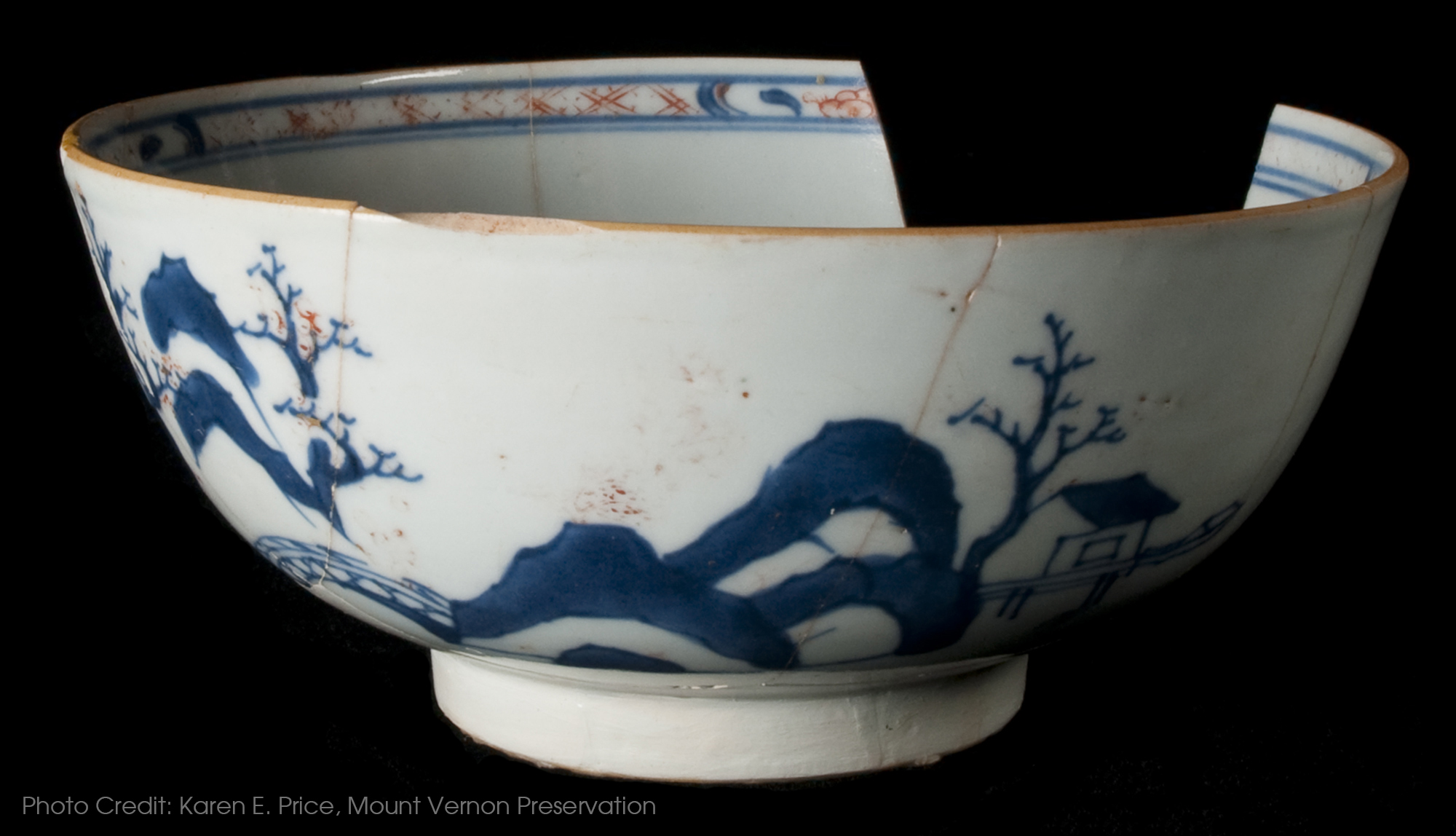 This Chinese porcelain bowl, with Imari decoration, would have been exceptionally costly due to its decoration and the effort required to produce it. This bowl displays typical Imari decoration: blue underglaze landscape scene with red and gold overglazed enamel. The exterior landscape scene is comprised of multiple elements, including structures, a bridge, trees, mountains, and other botanical elements. The red and gold overglaze are used on the interior trellis band as well as to highlight botanical features of the landscape scene. The blue decoration was applied prior to the glazing and final firing of the vessel, whereas the enamels were applied over the glaze. The very top of the rim itself also has a simple orange-brown band applied prior to the glazing process. Finally, note that this object includes several replicated pieces added in the 1980s to give the vessel structural integrity and to fill in large gaps for display purposes. These pieces have a more matte appearance than the actual porcelain vessel.