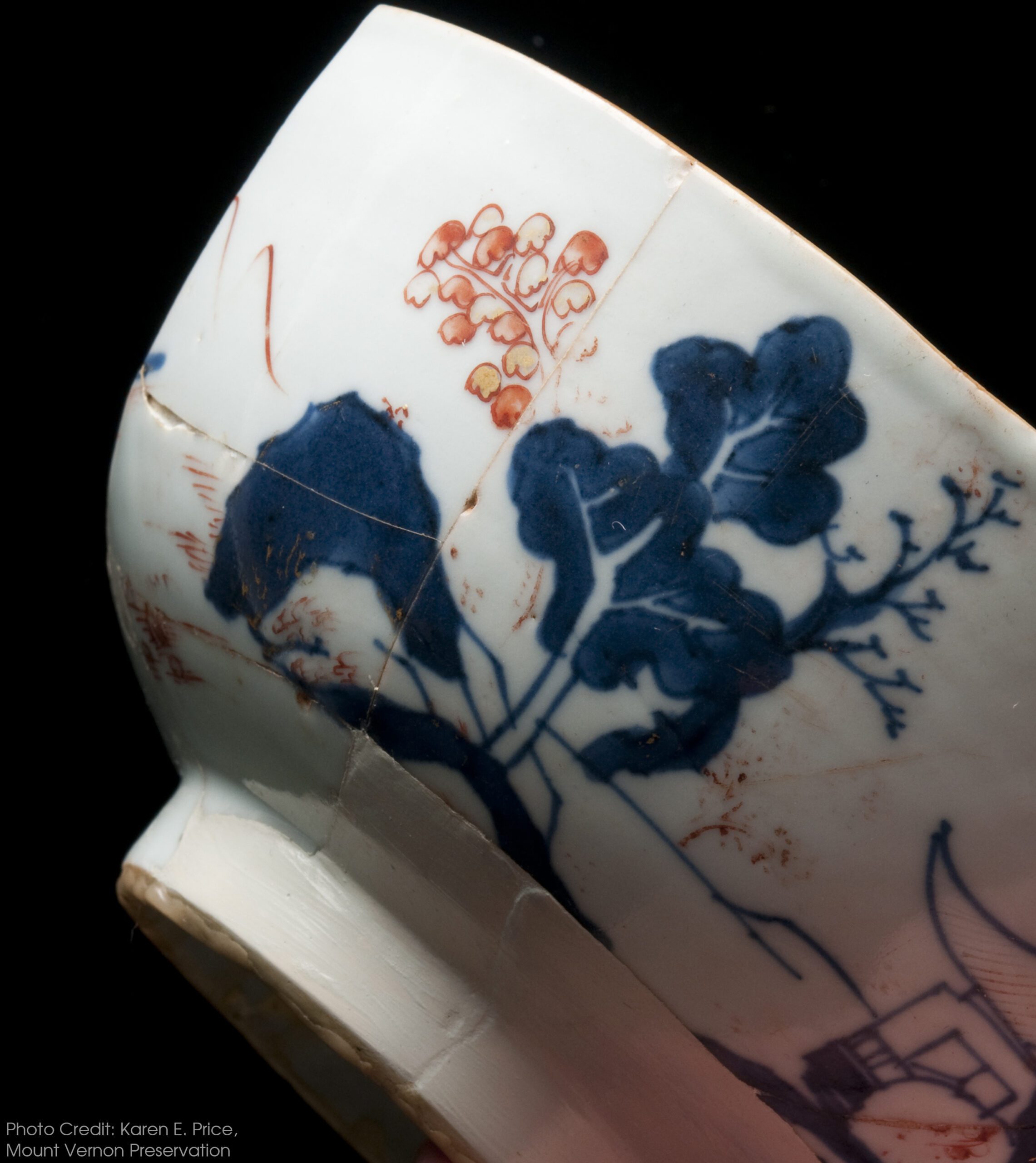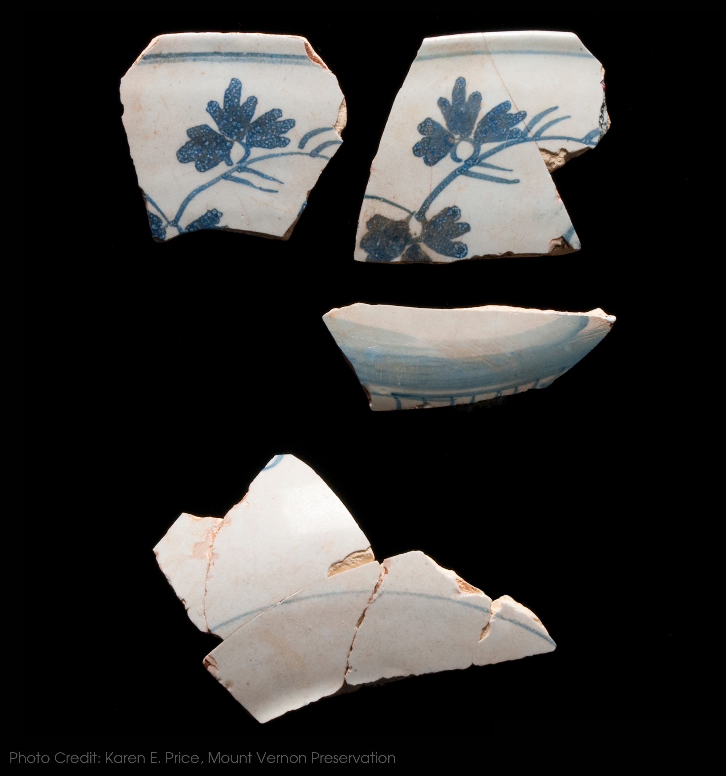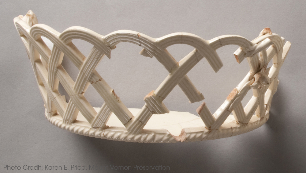 Most of the Delft excavated on Monticello Mountain was found, like this object, in the Dry Well. Delft was losing popularity by the time Jefferson began construction on the mountain in 1769 and was being replaced by Chinese porcelain and the newest and most popular ceramics exported from England, namely creamwares.