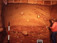 While excavating the Dry Well, excavators left a small portion of the feature intact and unexcavated. This photograph was taken at the end of the Dry Well excavations, viewing the unexcavated portion of the Well in profile. As one can see, the Dry Well was filled with layer upon layer of sediment. One can envision each of the thin layers visible in the profile as being deposited from different wheel barrows or shovels.