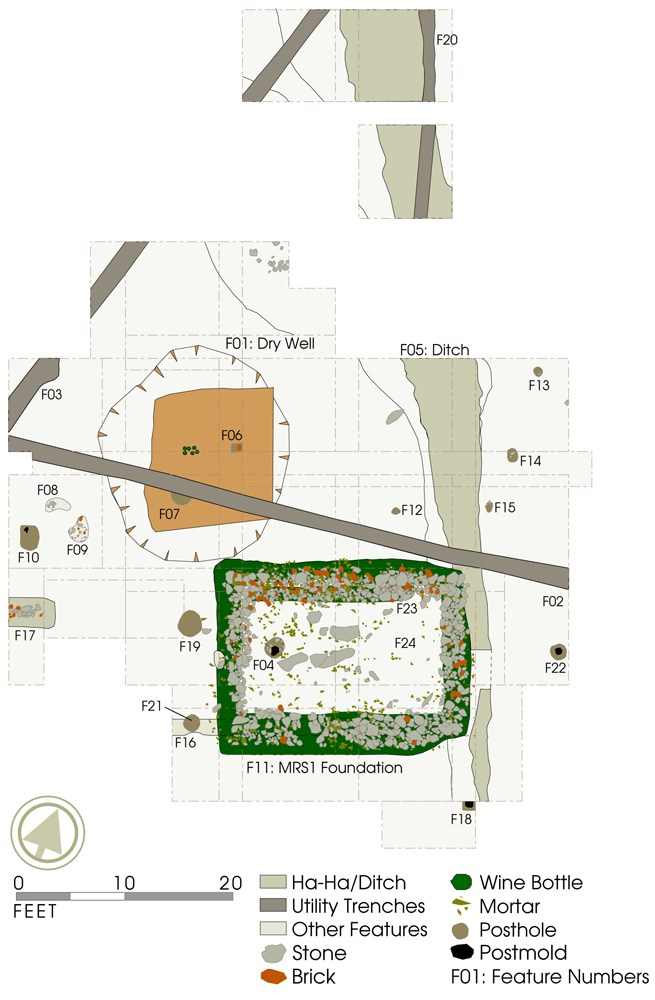 After scanning and digitizing all end-of-excavation maps generated by the original excavators, Monticello staff created this digital composite site map for the West Kitchen Yard. It includes all of the test units excavated under the direction of Dr. William Kelso over the course of three field seasons from 1979 to 1981. Beginning in 1979, Kelso dug several large test trenches, aligned east-west and seen on this map underlying the later square test units that encountered several large features. In 1980, Kelso returned to the area and conducted a block excavation using the Wheeler Box method creating 8-by-8-foot units with 2-foot balks between them. The Dry Well (F01) and the ditch feature (F05) were exposed and excavated during the 1980-1981 excavations. In the same season, the MRS-1 (F11) stone foundation was completely exposed and at least four samples of the foundation were removed, one from each of the four walls. Numerous other small features and fill deposits were also excavated.