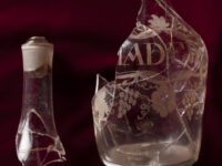 This thinly-blown, leaded glass decanter held Madeira, a dessert wine that was popular among the elite. The decanter’s acid-etched decoration, including grape vines and a central cartouche labeling the contents as MADEIRA, is typical of high-style glass vessels manufactured in the 1750s or 1760s. Thomas Jefferson imported Madeira throughout his lifetime and served it at Monticello.1