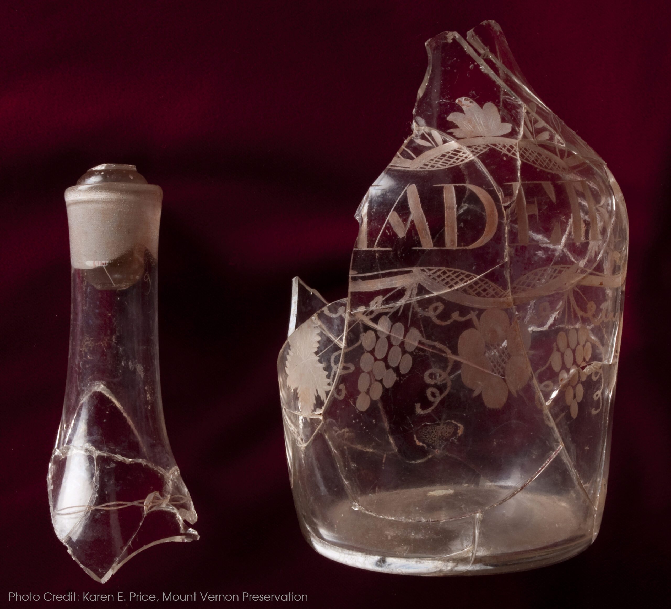 This vessel was excavated from several Dry Well deposits and was thus likely discarded in the late 1770s. Other leaded glass drinking vessels, including numerous stemware fragments, were also found in the Dry Well feature and are featured elsewhere in this gallery. The neck mends to the rest of the body, but the area that attaches the two segments is too small to attach them together and thus is photographed with the two sections adjacent to one another.