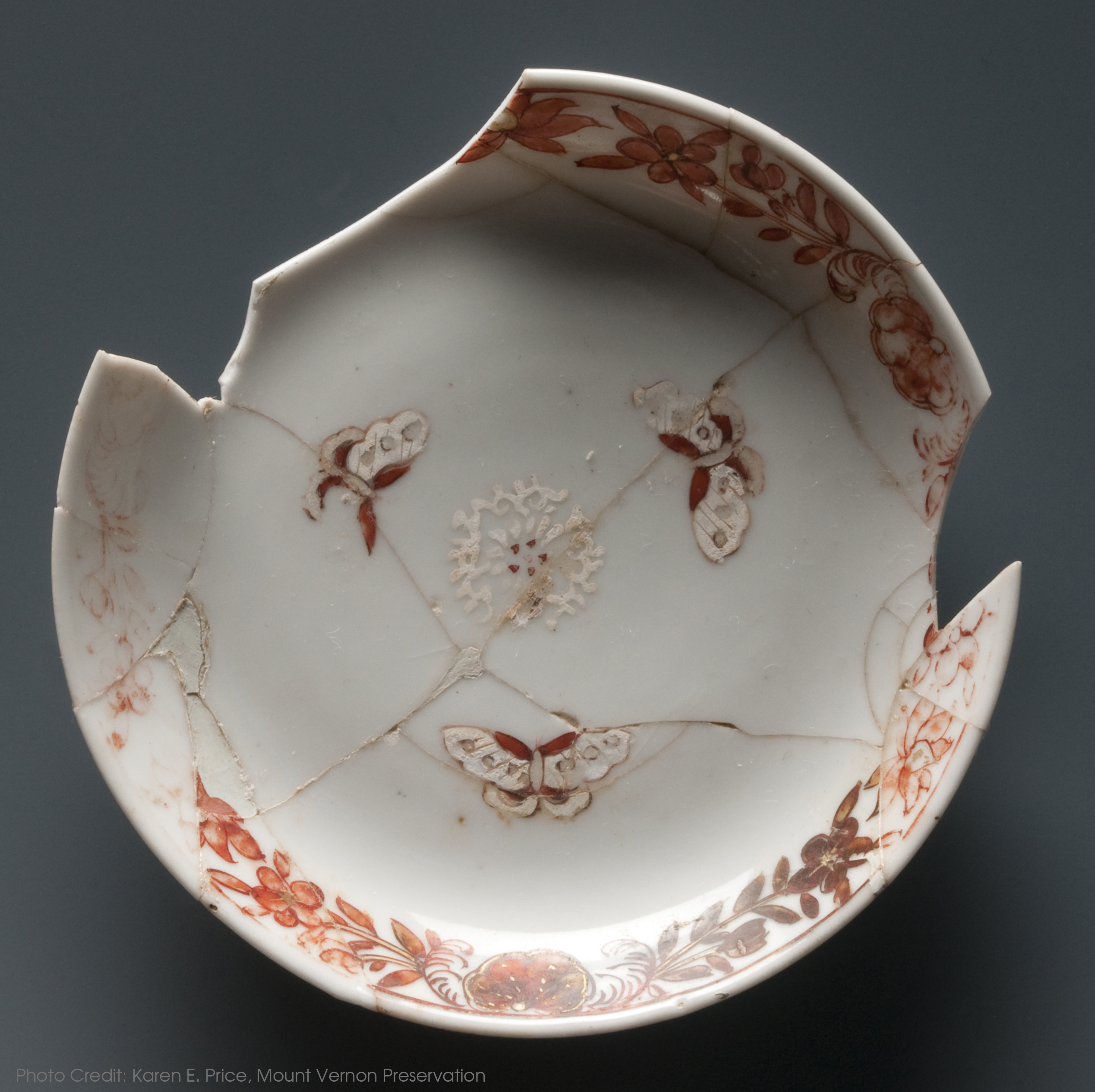 Found in the Dry Well, this Chinese export porcelain saucer includes an elaborate botanical band around the interior rim and an intricate depiction of three moths around a white flower on the center of the base. All of the decoration was executed in hand-painted over-glazed enamel, meaning that it was applied after the vessel was fired. While the red and white paints are easily visible, if one looks closely faint remnants of gilt decoration used on the botanical band can also be seen. The pattern name remains unknown.