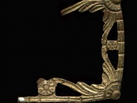 Found in an upper level of the Dry Well, this fragment of a shoe buckle frame is cast in copper alloy. Conservation in the 1980s restored its original brass-colored appearance. On two parts of the frame, seen on the broken edges of this fragment, there are remnants of silver-colored solder that may indicate an attempt to repair the broken frame for continued use. Open work, intricate designs, and delicate appearances such as this were common on Colonial period shoe buckles, indicating the decorative as well as functional use of these accessories.