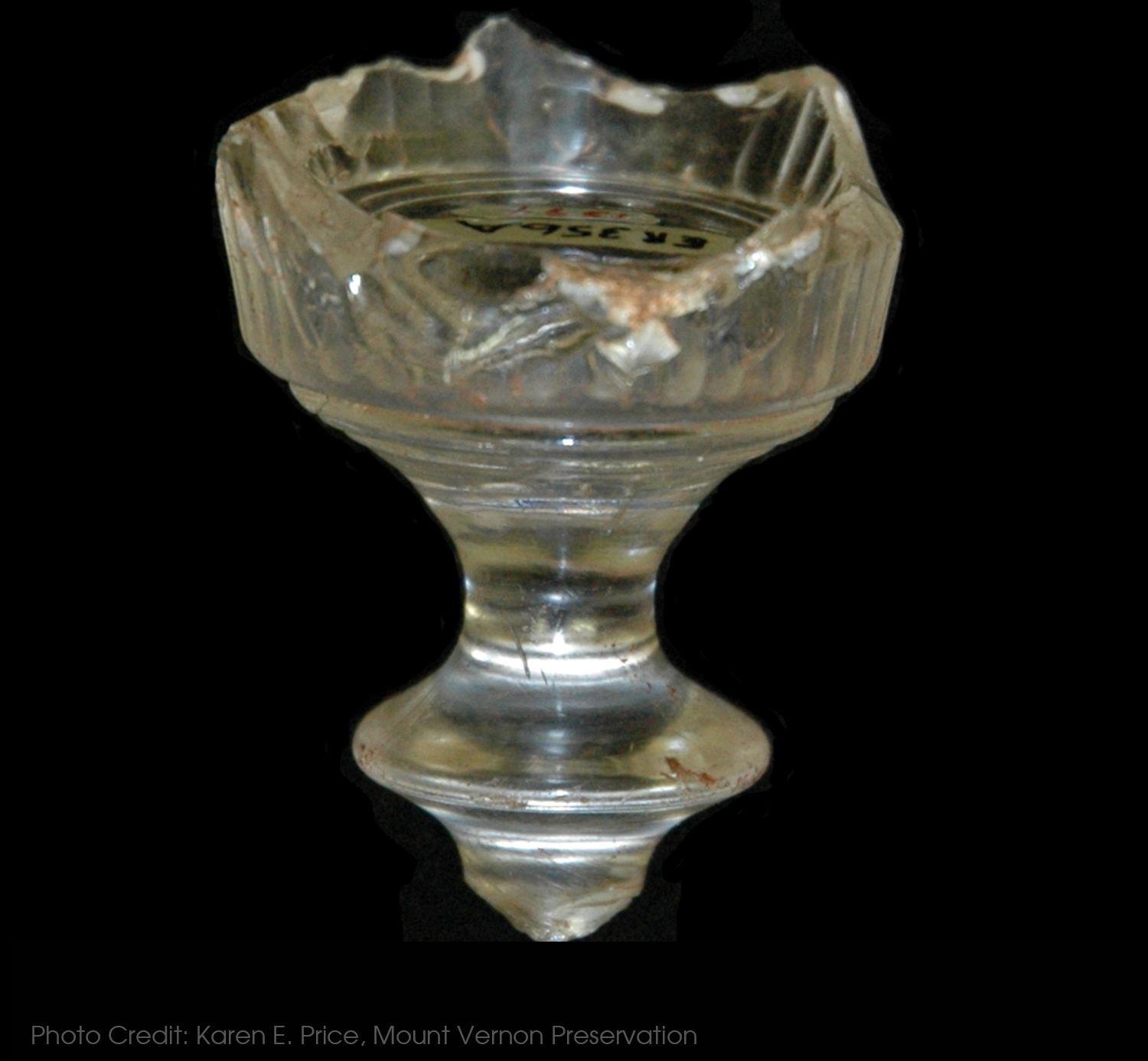 A wide variety of glass vessel and forms, including wine bottles, pharmaceutical bottles, drinking glasses, tumblers, and stemwares, were found during excavations at the West Kitchen Yard. This small cordial or aperitif glass is an example of one of those stemwares found during excavation. Made of leaded glass and decorated with cut flutes and hand-formed bladed knops1, this stemware was likely manufactured in England and imported to the Colonies. Other decorated leaded glass fragments found in the Dry Well included enamel and air twist stemware stems, etched glass, and additional cut or ground decoration.