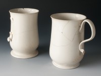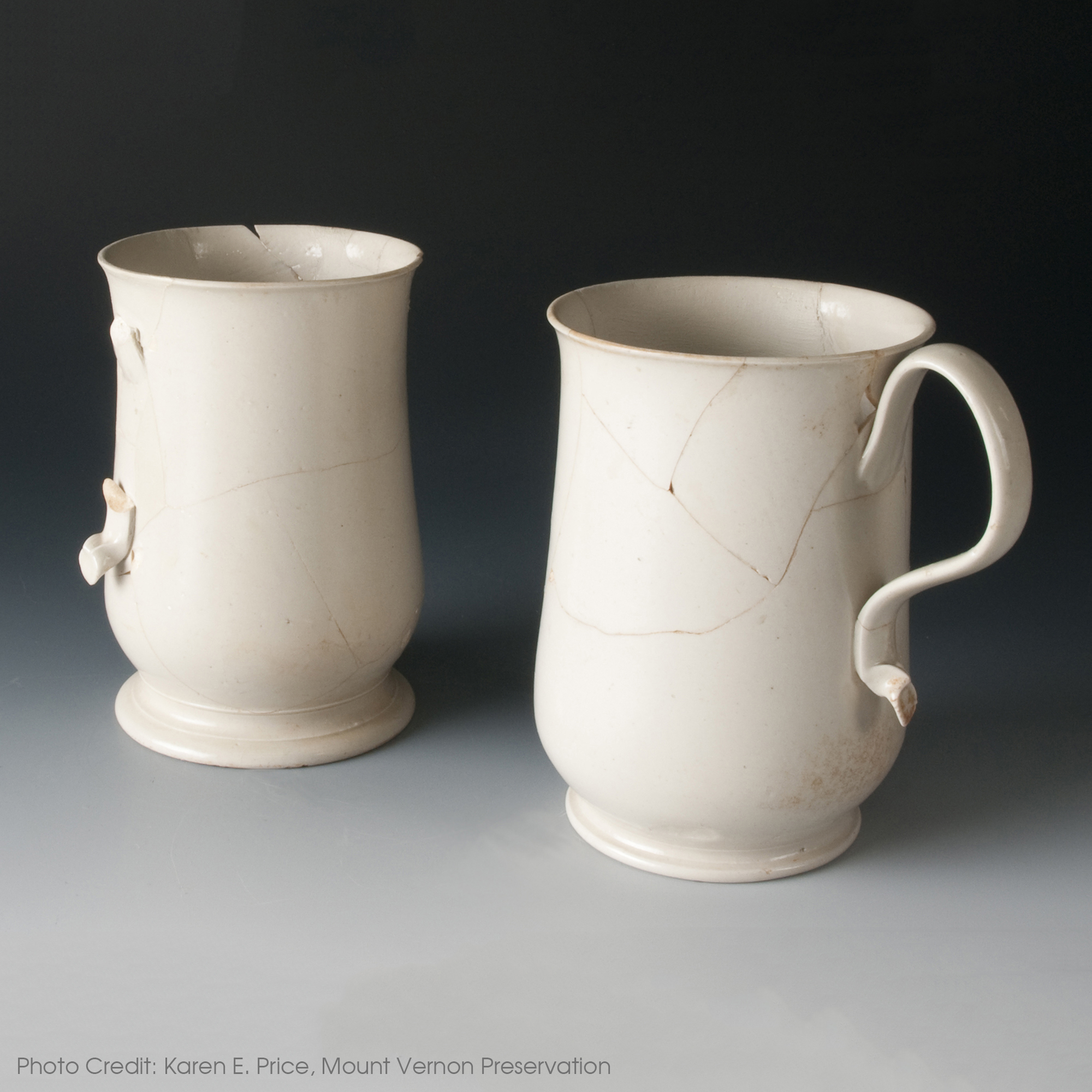 Found in the Dry Well, these two finely potted mugs are believed to be examples of chocolate mugs manufactured between c.1750-1760 in Staffordshire England.1 Fragments of a third mug, much more fragmentary and only partially reconstructed after excavation, were also found during the Dry Well excavations. Portions of these mugs were reconstructed in the 1980s using a plaster-like substance, which can be differentiated from the original white salt glaze sherds by its matte appearance.