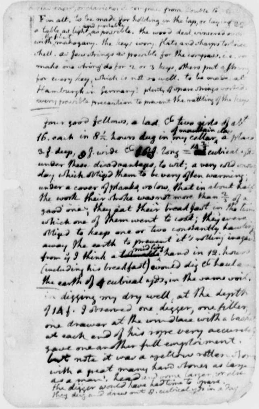 In an entry in his Memorandum Book from December 1770, Jefferson documented the construction process of the Dry Well: “in digging my dry well, at the depth of 14f. I observed one digger, one filler, one drawer at the windlass with a basket at each end of his rope very accurately gave one another full emploiment [sic] but note it was a yellow rotten stone with a great many hard stones as large as a man’s head and some larger, or else the digger would have had time to spare. They dug and drew out 8. cubical yds in a day.”1