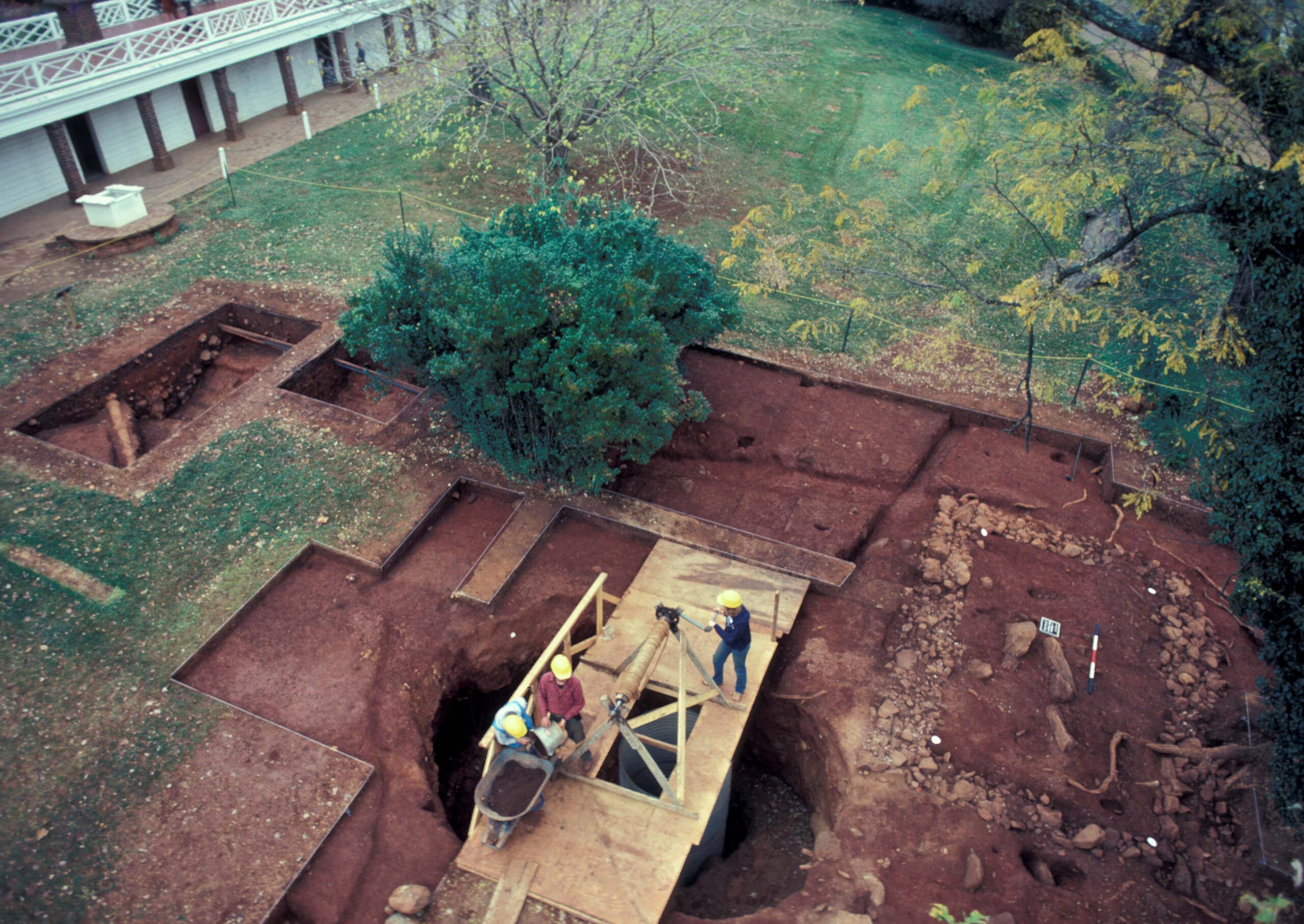 This photograph is an overhead view of the West Kitchen Yard excavations, facing northeast. Taken near the end of excavations, the Dry Well is in the foreground, the MRS-1 (F11) stone foundation is to the south, and the ditch (F05) is to the north. The South Dependency wing of the Monticello mansion is visible in the background. Under the direction of Dr. William Kelso, this block excavation included over 45 excavation units, over 350 individual archaeological contexts, and recovered more than 100,000 artifacts over the course of three field seasons from 1979 to 1981.