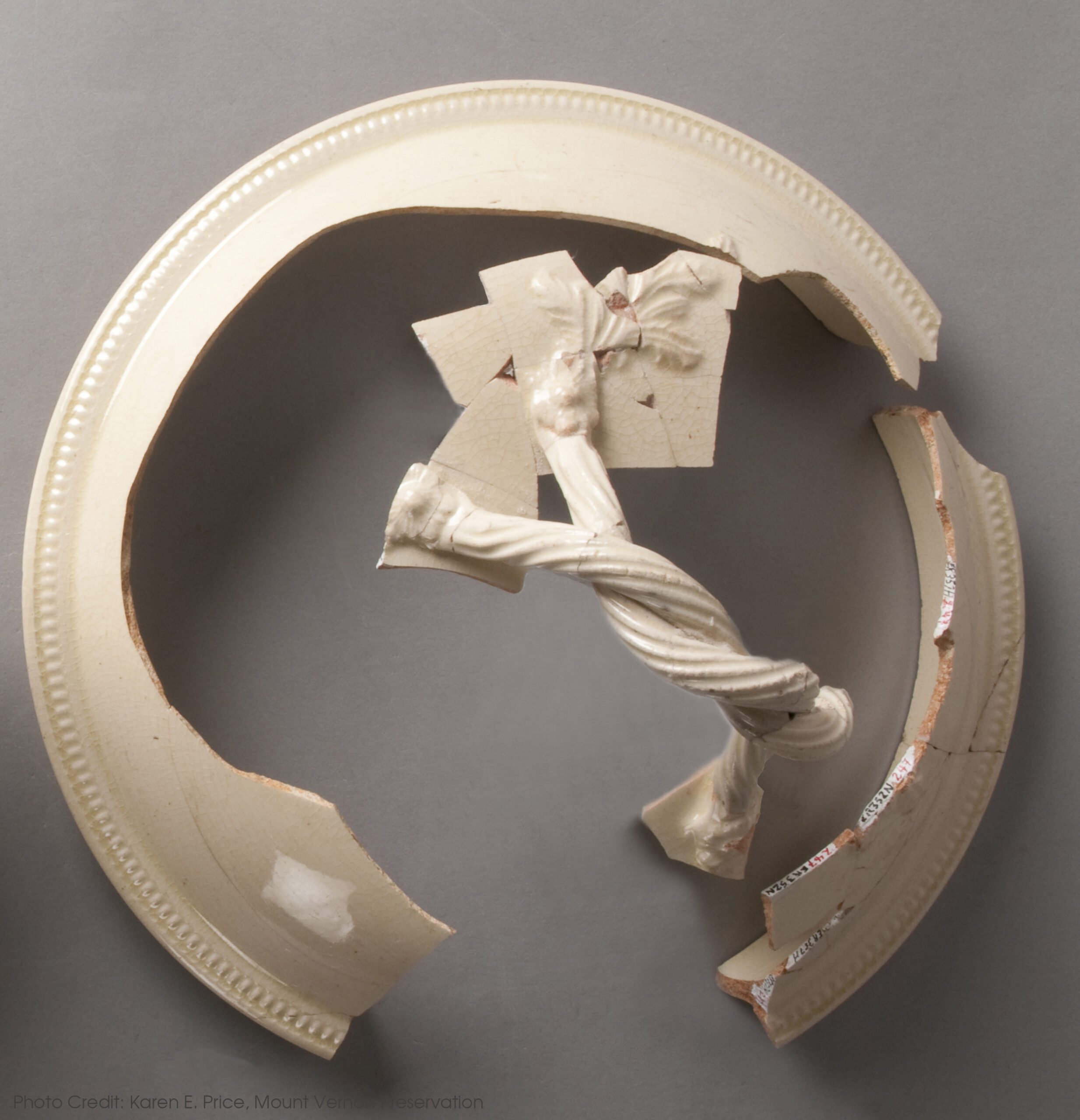 This creamware tureen lid has a double twisted handle with sprig-molded floral elements where it attaches to the main lid section. There is a delicate beaded band around the lid’s lip. The body of the tureen was not found during excavation.
